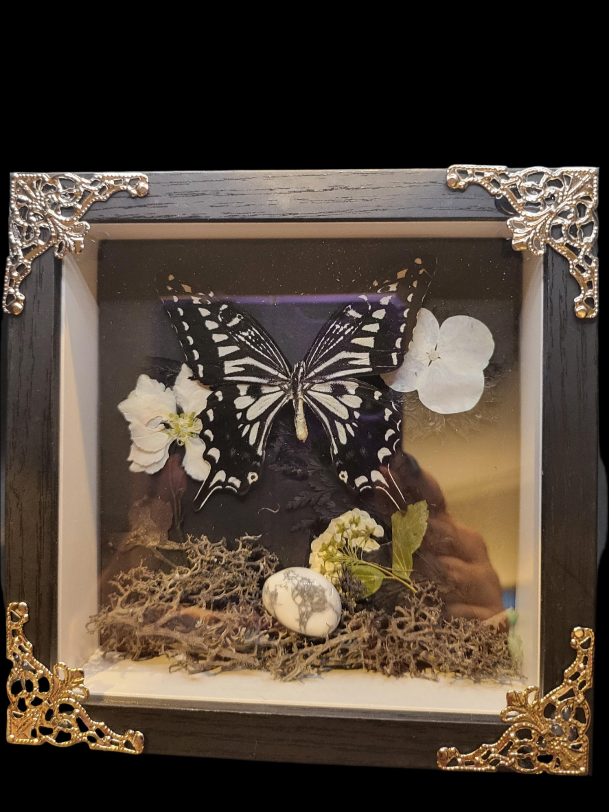 Discover the magnificent beauty of the Asian swallowtail butterfly captured in a 6x6 handmade shadow box. Admire its vibrant colors and intricate details as it floats gracefully on your wall. Perfect for any nature enthusiast or art lover.